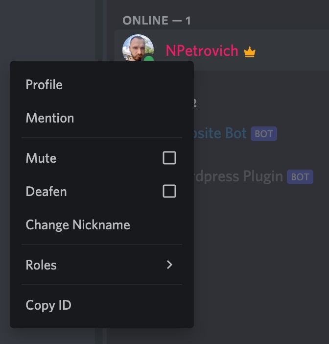 Now you have enabled hidden options of the Discord client. To find members or guild IDs, you can use the context menu. Click on the user avatar, channel name, or guild thumbnail and choose Copy ID.