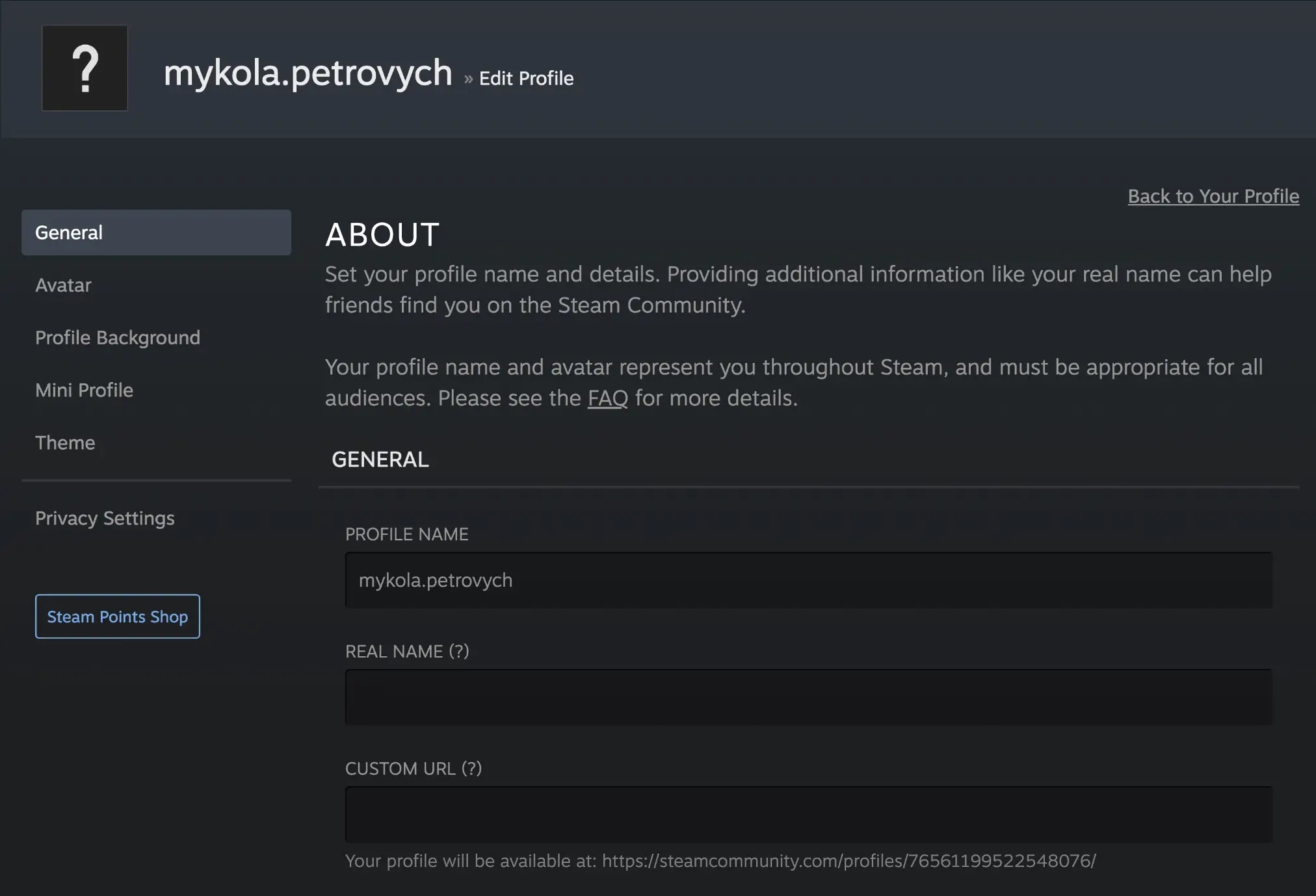 Also, you can find your profile ID in the profile settings. Click Edit my Profile in the right sidebar on the profile page. In the General tab, scroll down to the Custom URL input. You will see your Steam ID in this input or in the help tip beneath it.