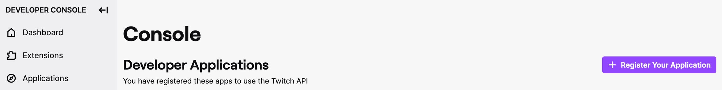 Go to an applications page dev.twitch.tv/console/apps and press a Register Your Application button in the top right corner.