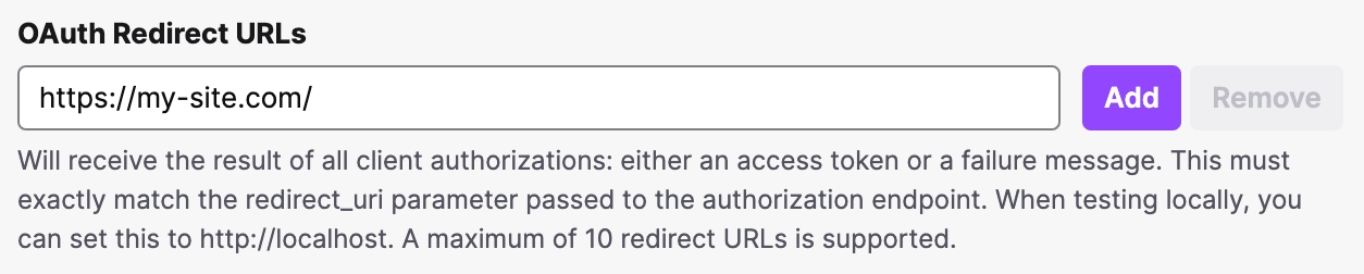In the OAuth Redirect URLs section, add your domain name in the format https://my-site.com/