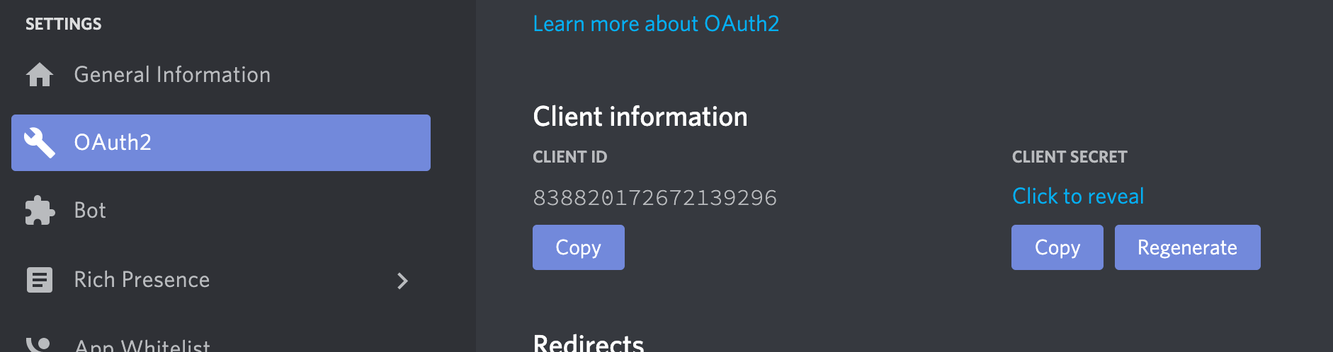 To get a Client ID and Client Secret keys, go to the OAuth2 page of the Discord application and copy them from the Client information section.