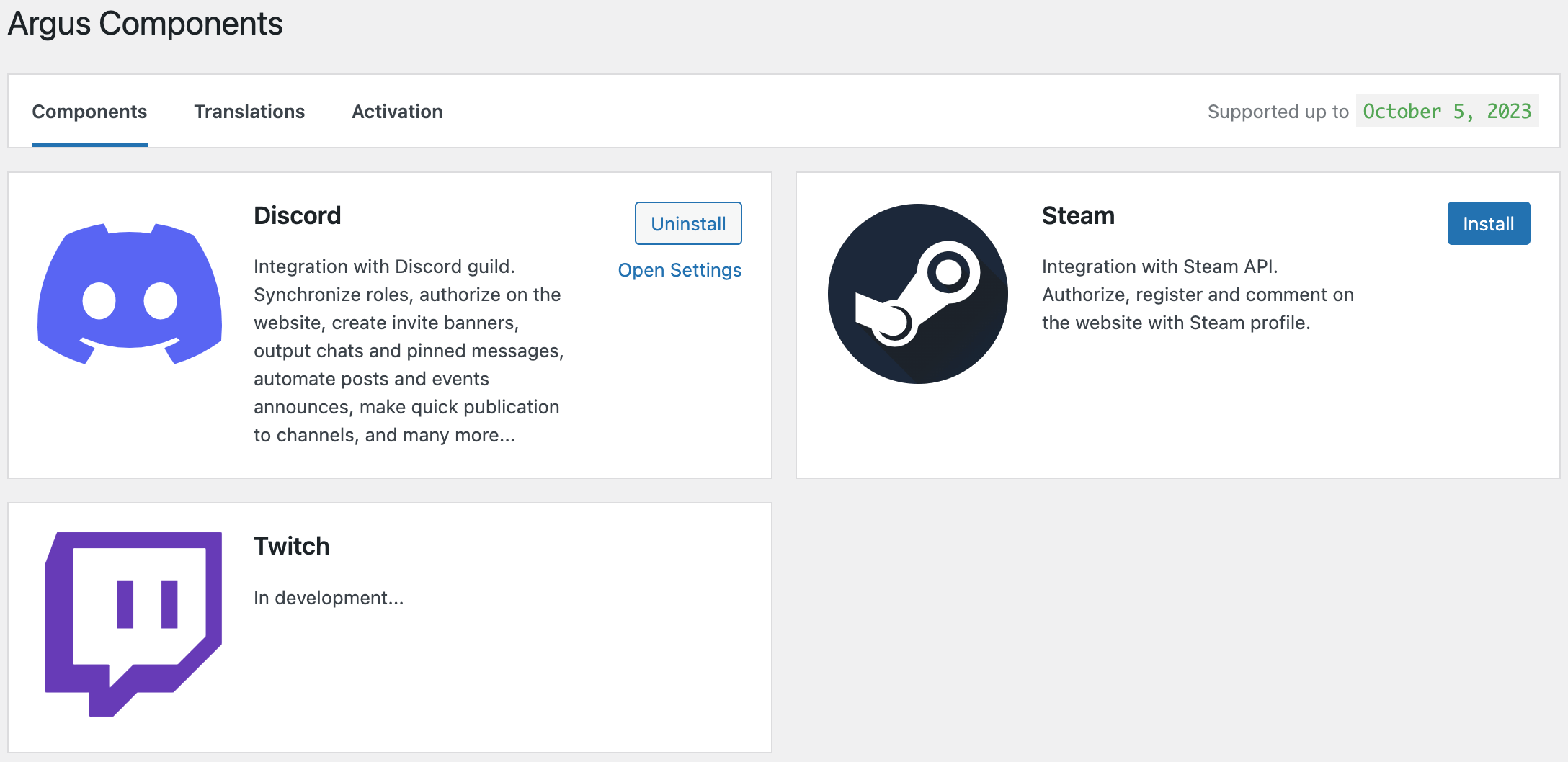 Go to your WordPress admin panel, and in the left menu, select Plugins --> Argus Components. In the first tab, Components, you will see a list of the available modules. Click Install to activate the component you need.
