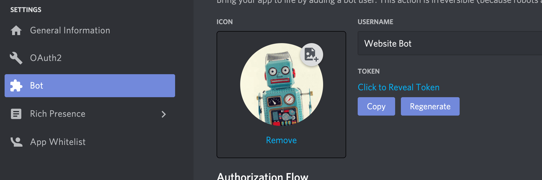 To get the Bot Token key, go to the Bot page of the Discord application and copy them from the Build-A-Bot section.