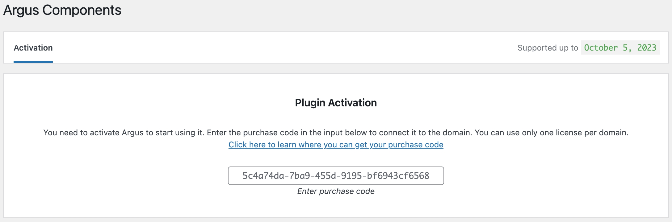 Go to your WordPress admin panel, and in the left menu, select Plugins --> Argus Components. In the middle of the screen, you are supposed to see the input for the purchase code.