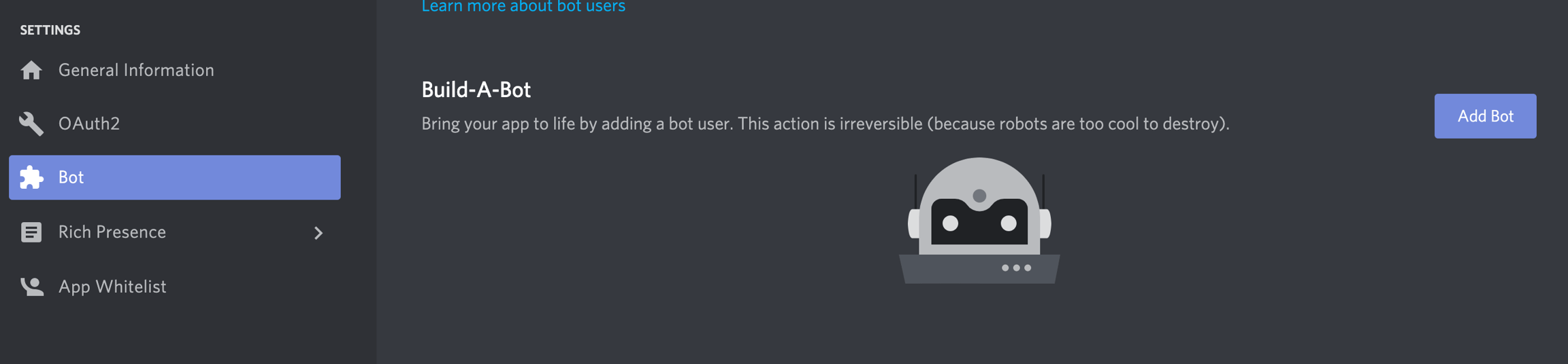 Now go to the Bot page from the left main menu and use the Add Bot button to add a new bot.
