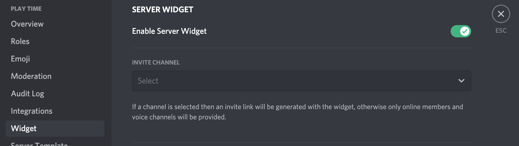 Now, go to the general settings of the server in your Discord application (it is not in discord.com/developers/ portal, look for it in the regular client) and go to the Widget page. There, enable the Enable Server Widget option.