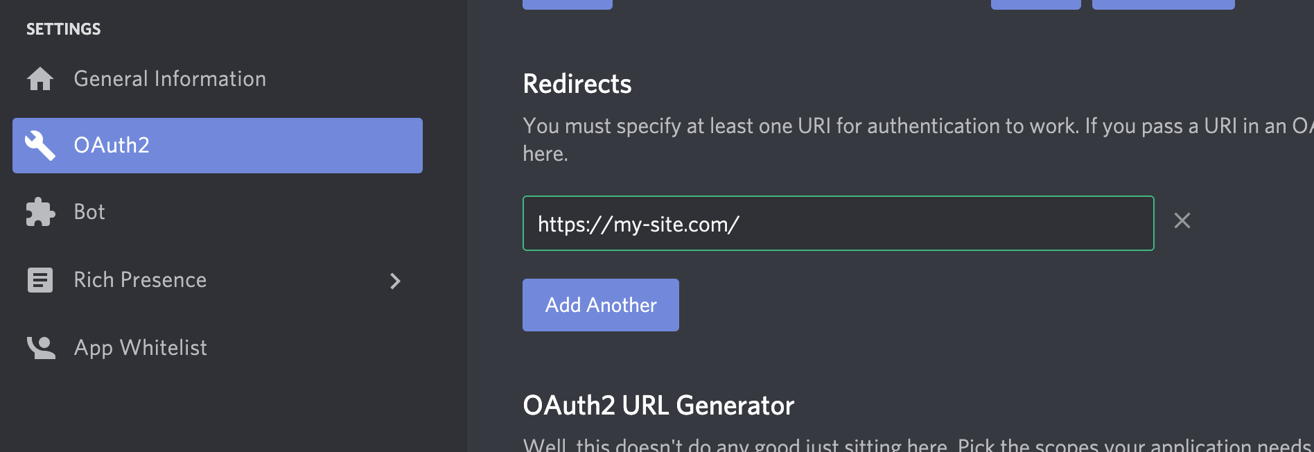Now go to an OAuth2 page from the left side main menu. There, you will find a Redirects section. Use the Add Redirect button to add your domain name in the format https://my-site.com/