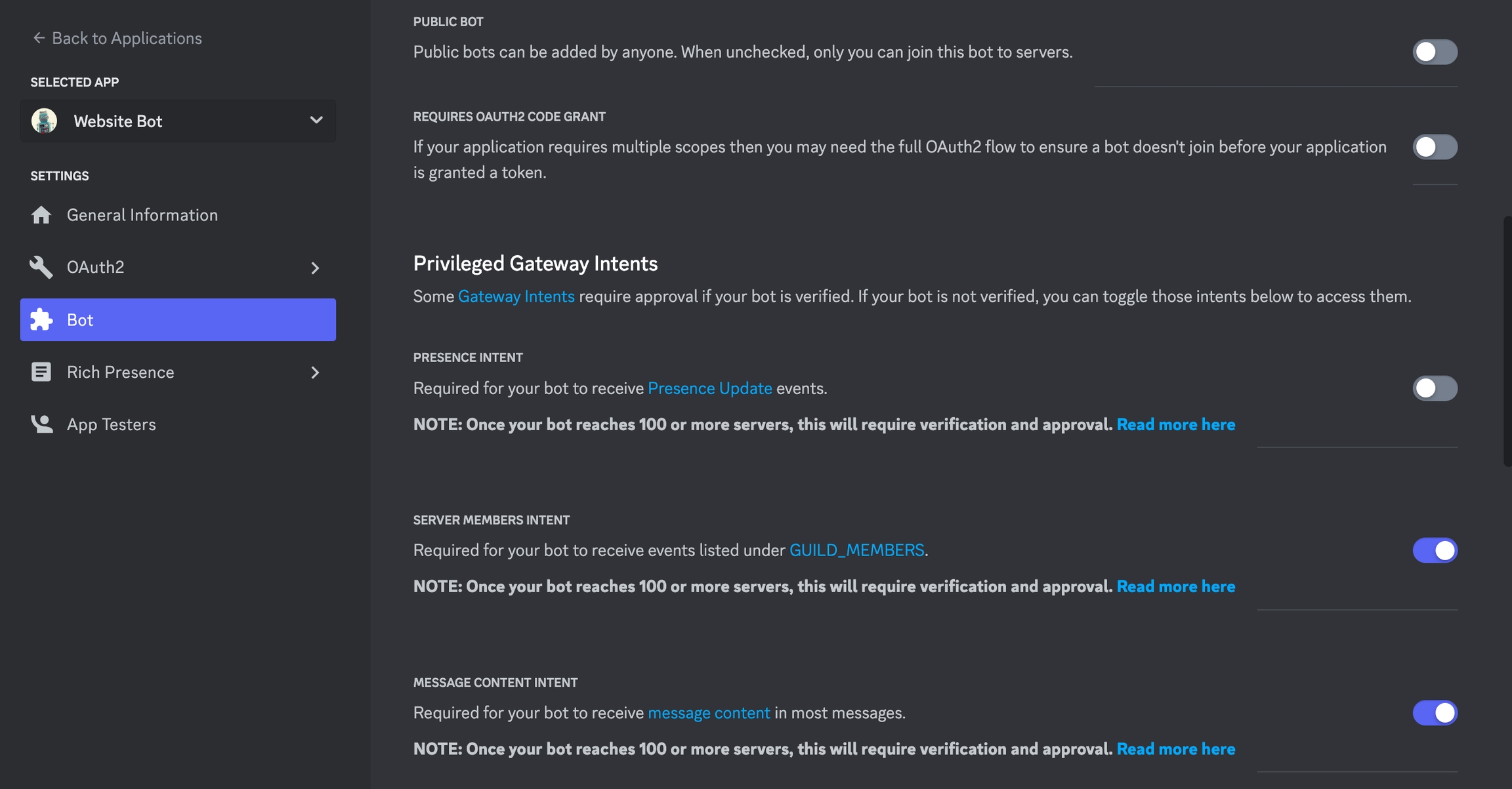 A new bot will appear. You can assign a username and an icon for the bot. This will be the name and avatar of messages the plugin sends from the website. If you scroll a little further, you will see the bot settings. You must disable the PUBLIC BOT option for proper work and enable the SERVER MEMBERS INTENT and MESSAGE CONTENT INTENT options.